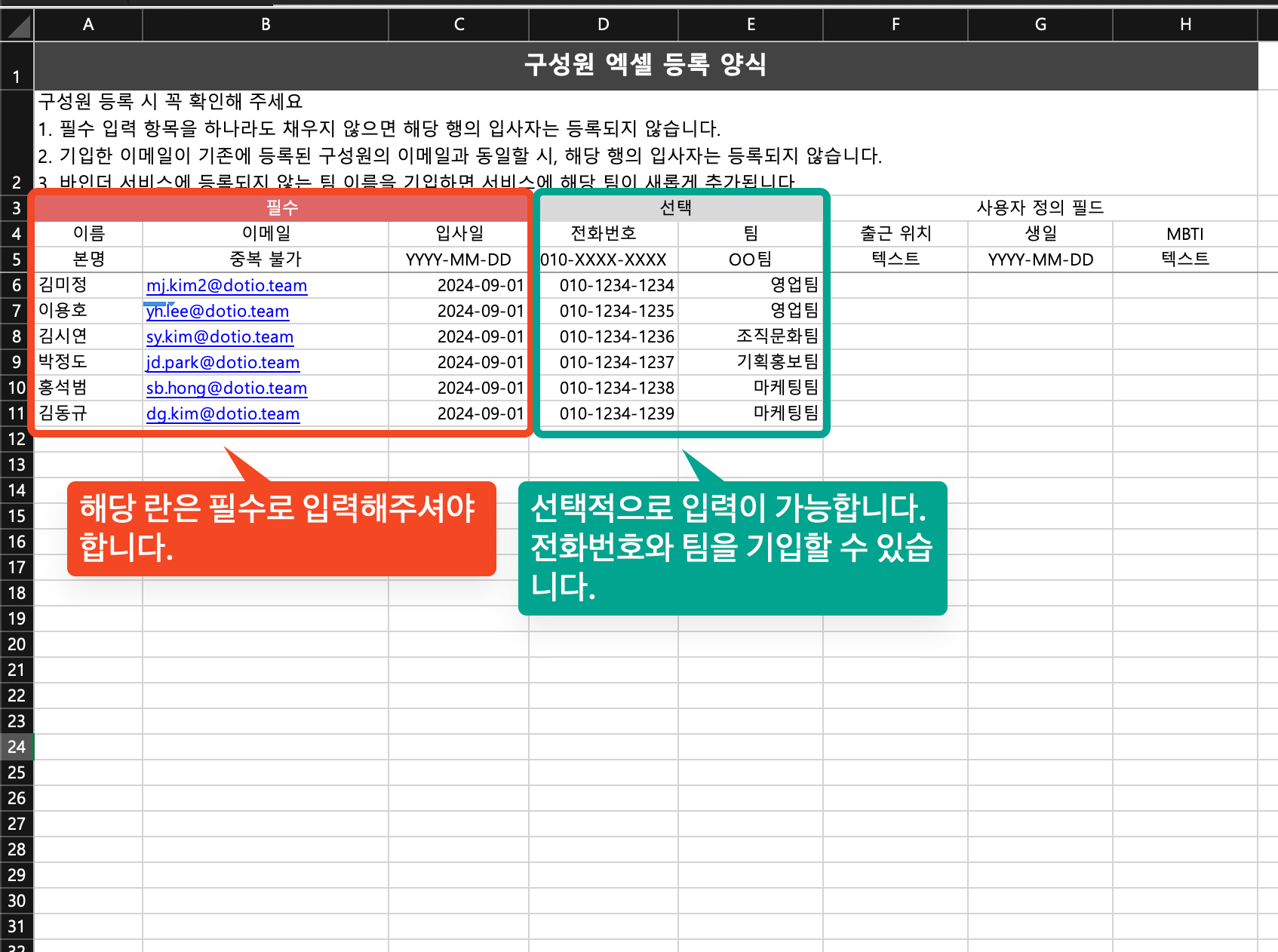 2️⃣ 다운로드 받은 엑셀 파일을 실행하고, 엑셀 파일에 추가할 구성원분들의 정보를 기입해주세요.