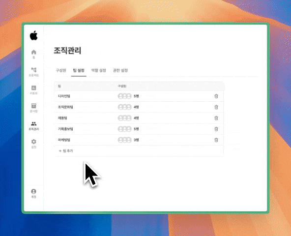 좌측 조직관리 탭을 누른 뒤, 상단의 팀 설정 탭을 클릭합니다. 해당 페이지에서 팀을 추가할 수 있습니다.