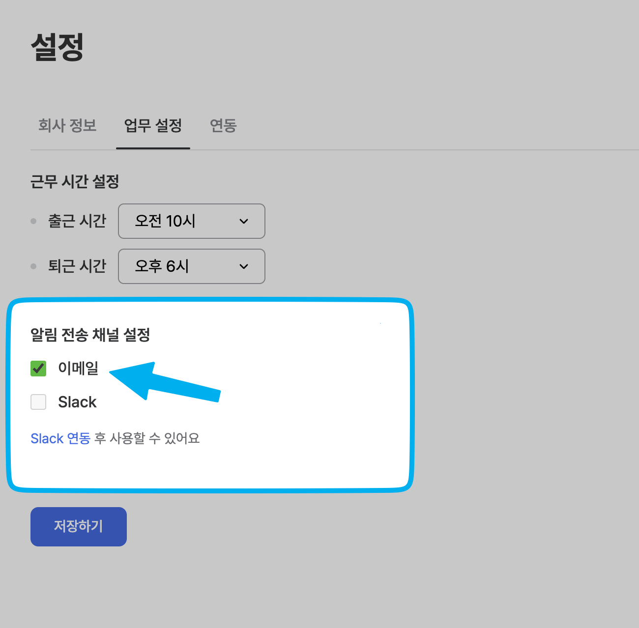 회사의 업무 시간 설정과 온보딩 이해관계자들에게 메시지가 전달되는 채널을 설정하는 방법을 소개합니다.2.1 출퇴근 시간 설정하기