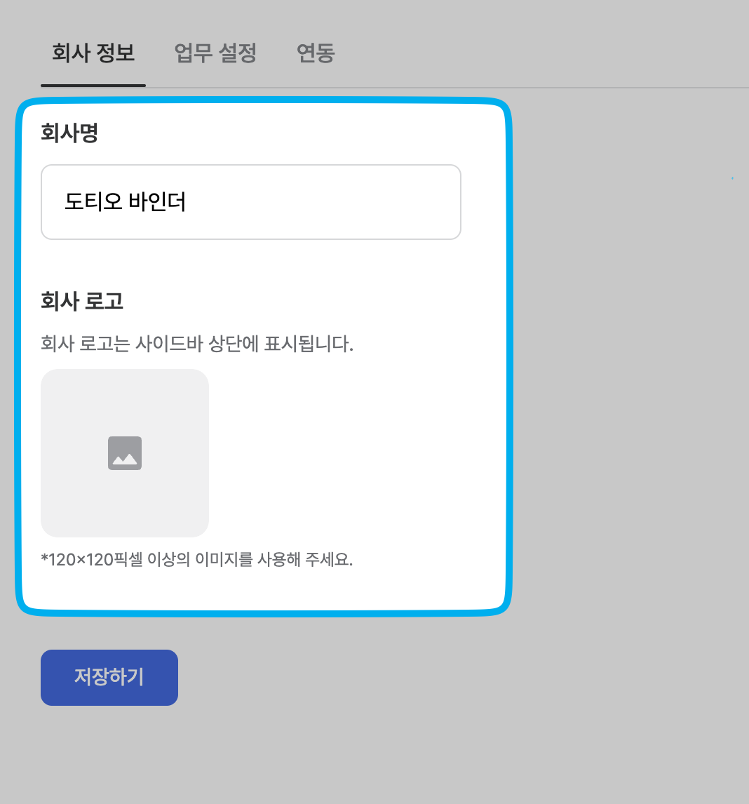 회사명과 회사 로고를 수정한 뒤에 [저장하기] 버튼을 누르면 회사 정보가 수정됩니다.