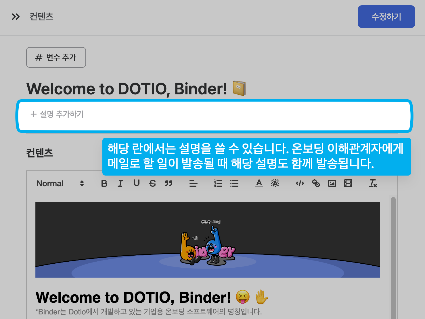 온보딩 이해관계자에게 글, 이미지, 동영상, 파일 등으로 구성된 문서를 전달할 수 있습니다.