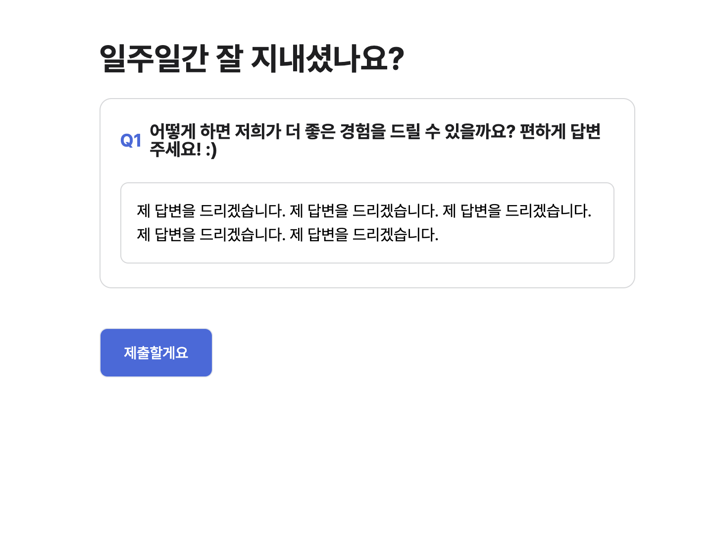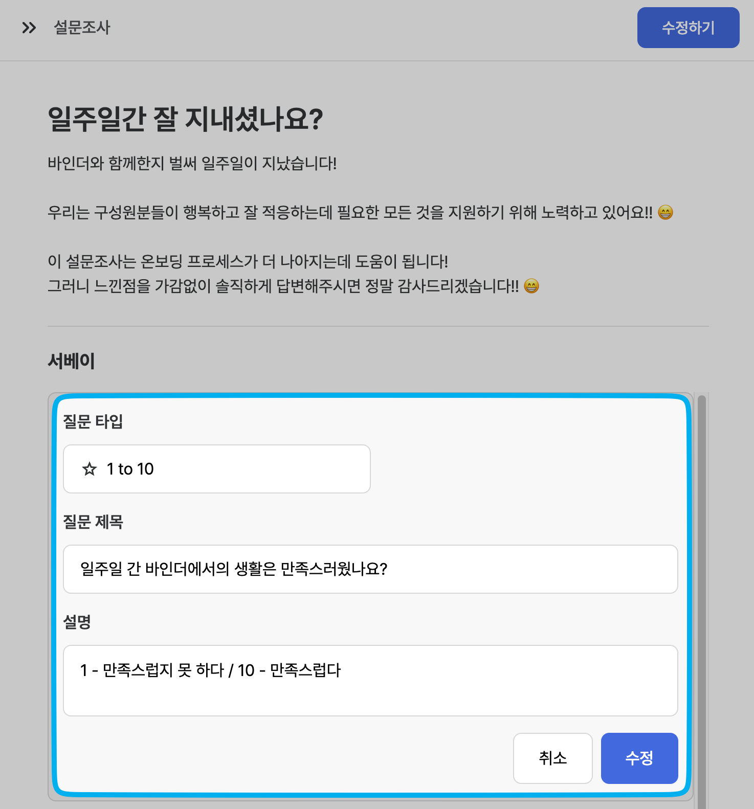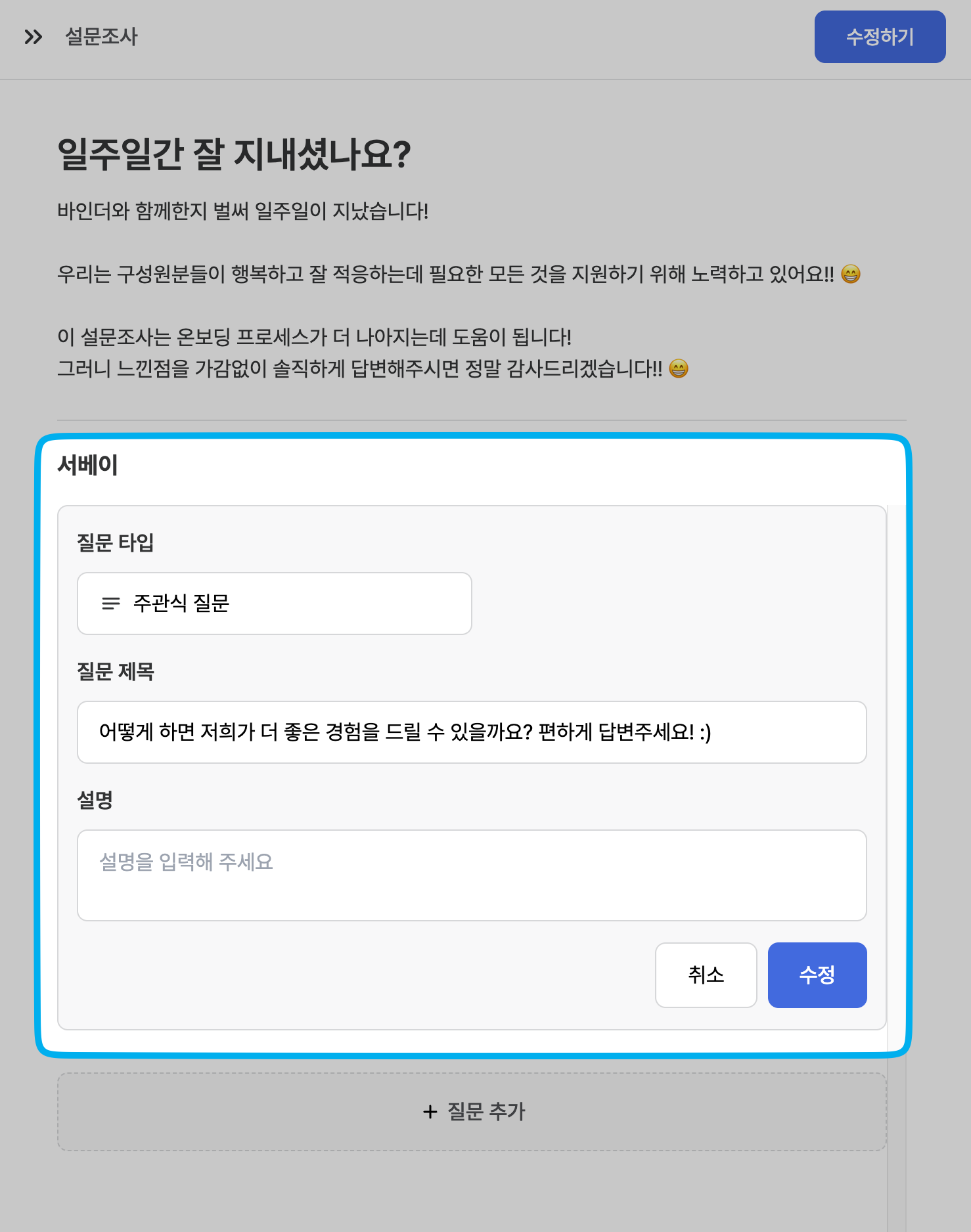 온보딩 이해관계자에게 자유로운 형식의 답변을 요청할 수 있습니다.