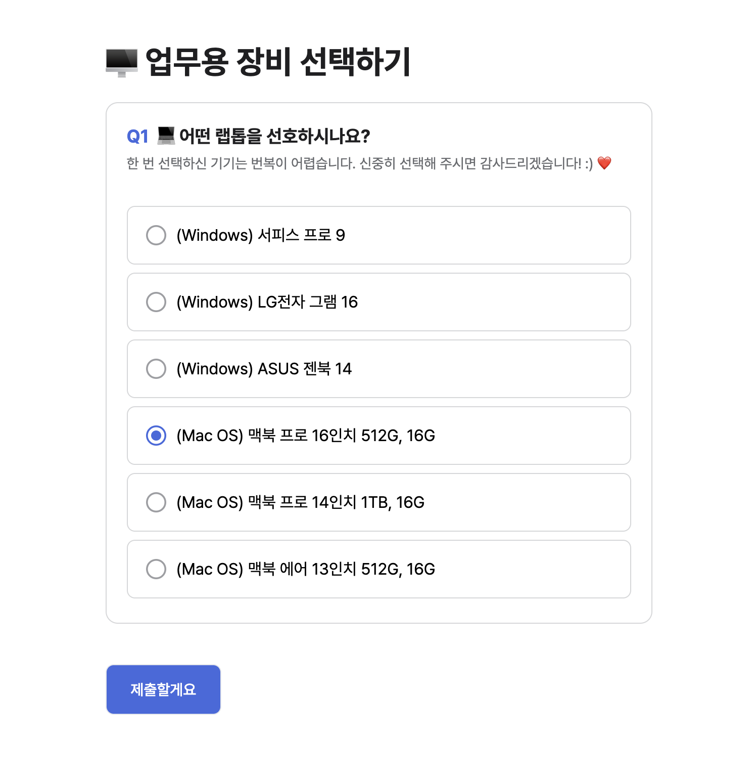 온보딩 이해관계자에게 정의된 보기 목록에서 하나의 답변을 선택할 수 있는 간단한 폐쇄형 질문을 요청할 수 있습니다.
