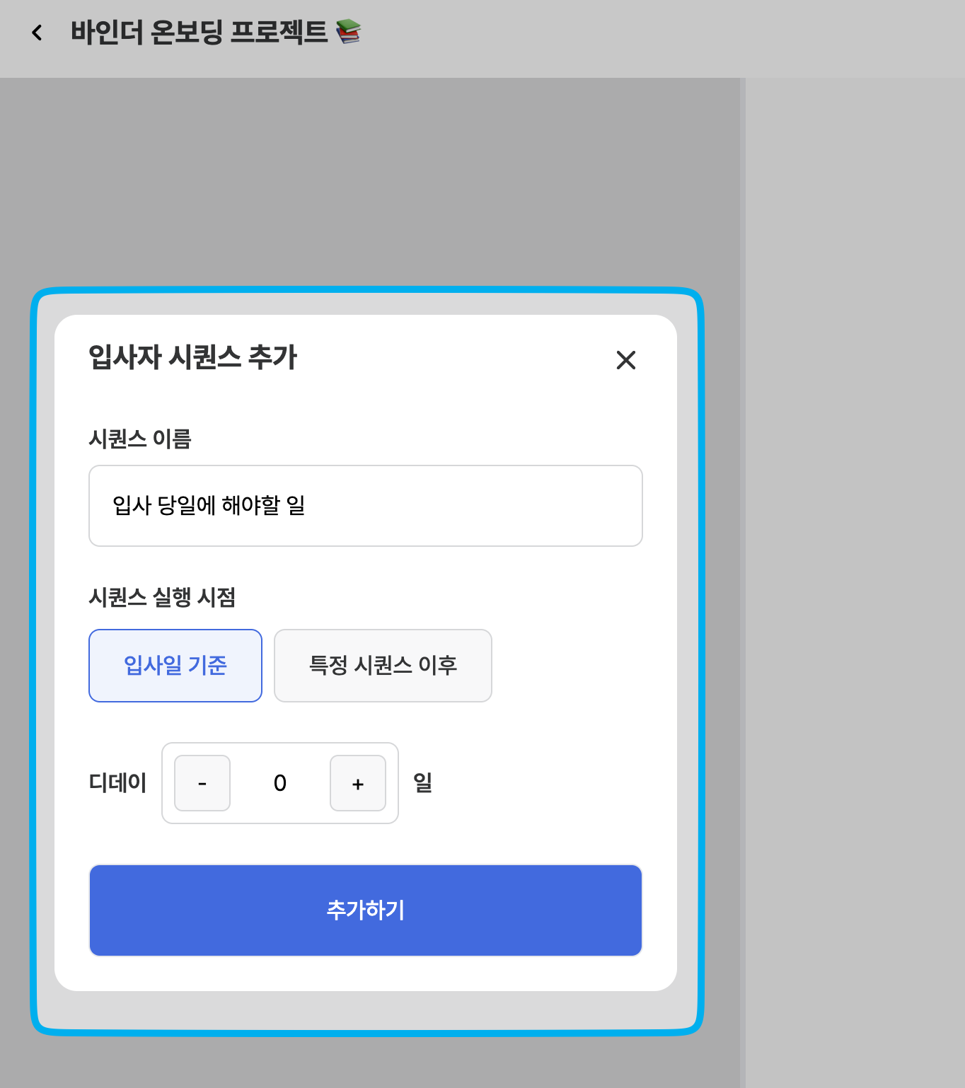 시퀀스는 타임라인을 구성하는 개체입니다. 입사일을 기준으로 ‘입사 14일 전 시퀀스’, ‘입사 3일 후 시퀀스’등을 생성할 수 있습니다.시퀀스를 생성하여 할 일을 추가할 수 있습니다.